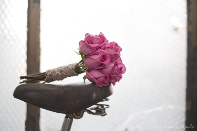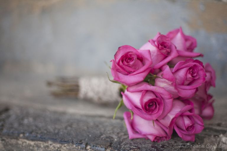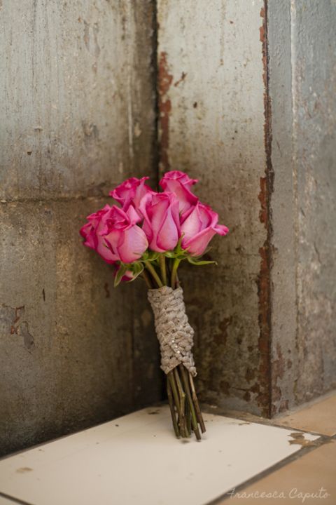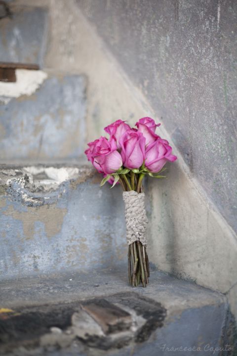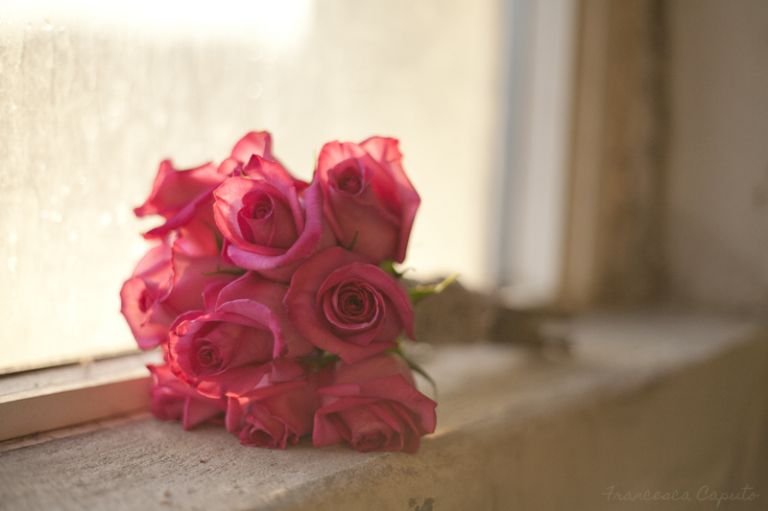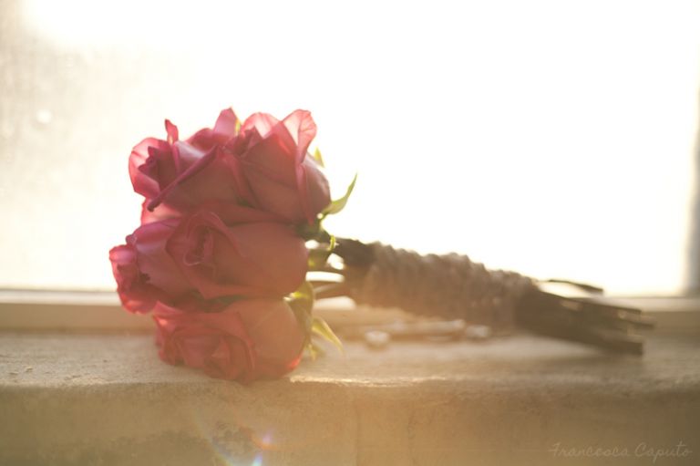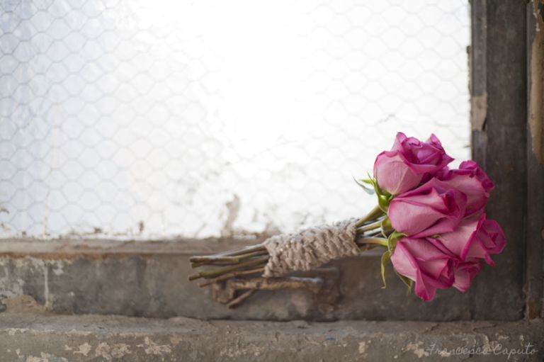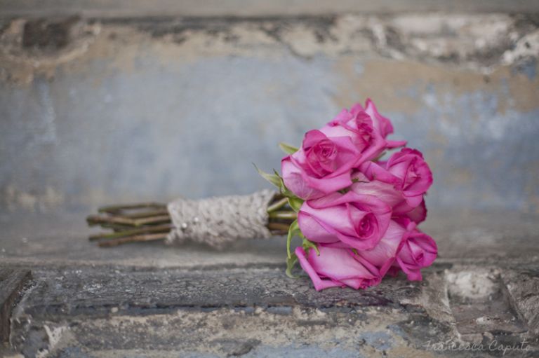 I delicately removed the less attractive petals, wrapped the roses in a grey headband and fastened it with some straight pins from my makeshift sewing kit. The first location was dimly lit so I bounced my flash off of the wall at an angle to light the front of the bouquet.